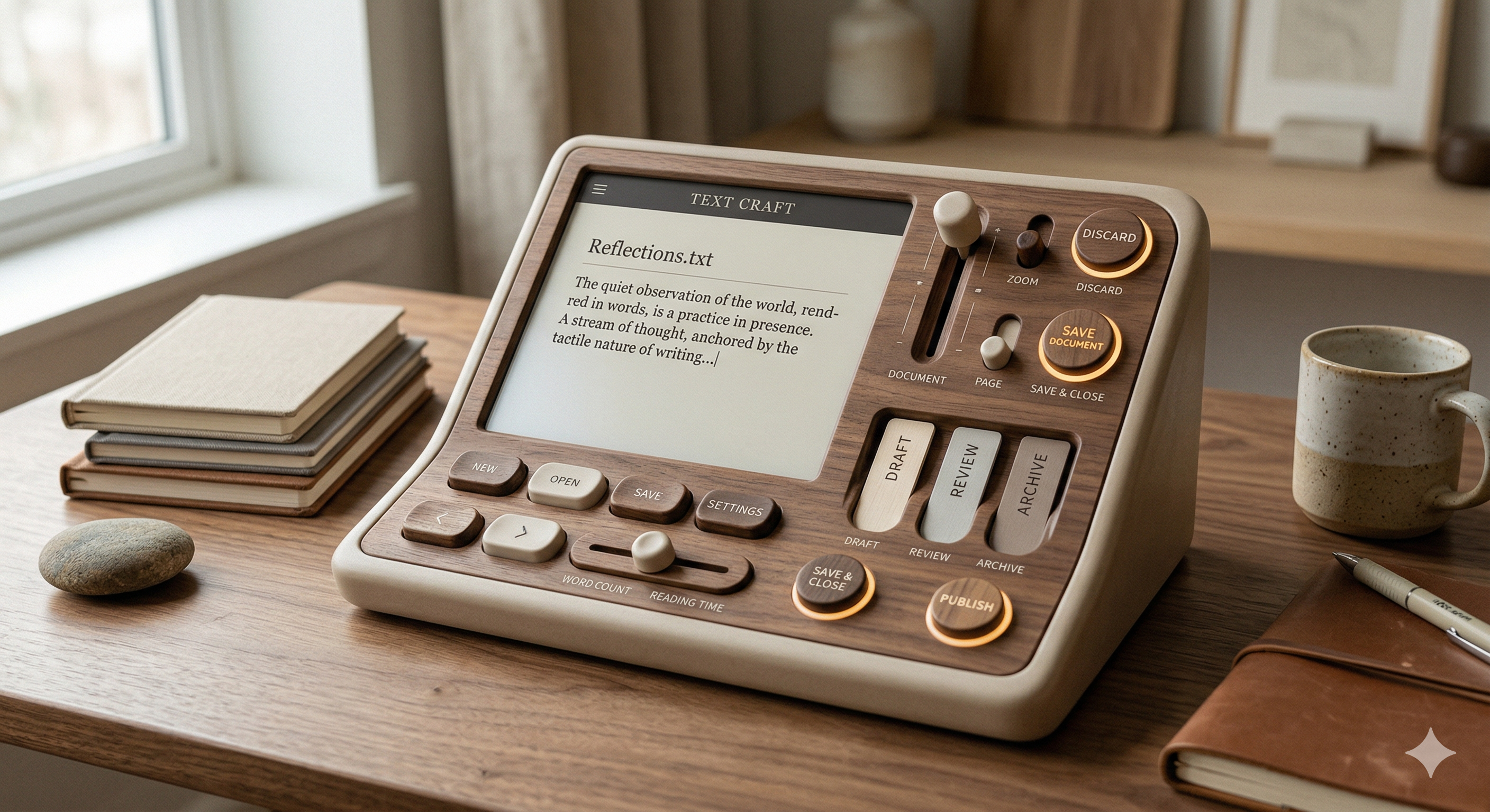 The main writing surface. A clean rich-text editor supports bold, italic, and two levels of heading. A status bar at the bottom shows your current line, column, and running word count.